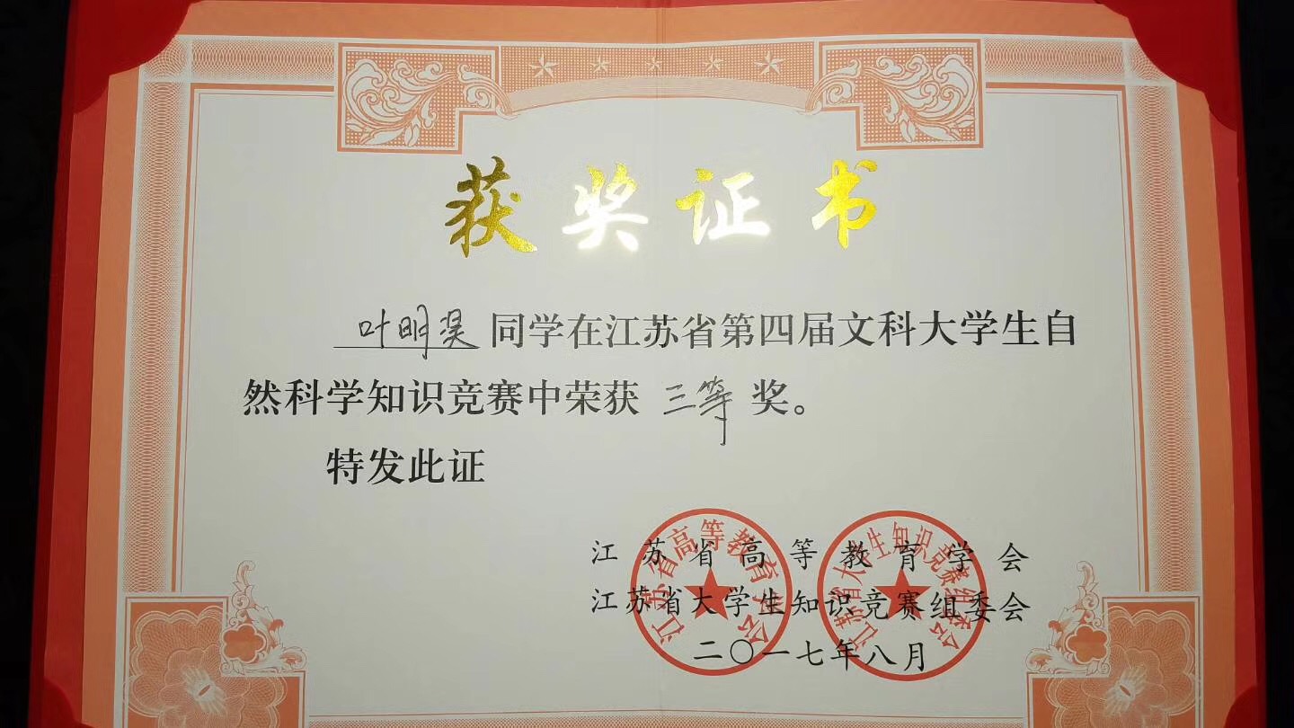 2017年9月23日下午江苏省第四届文科大学生自然科学知识竞赛决赛暨颁奖典礼在南京艺术学院实验剧场举行,我校取得近几年来最佳成绩。