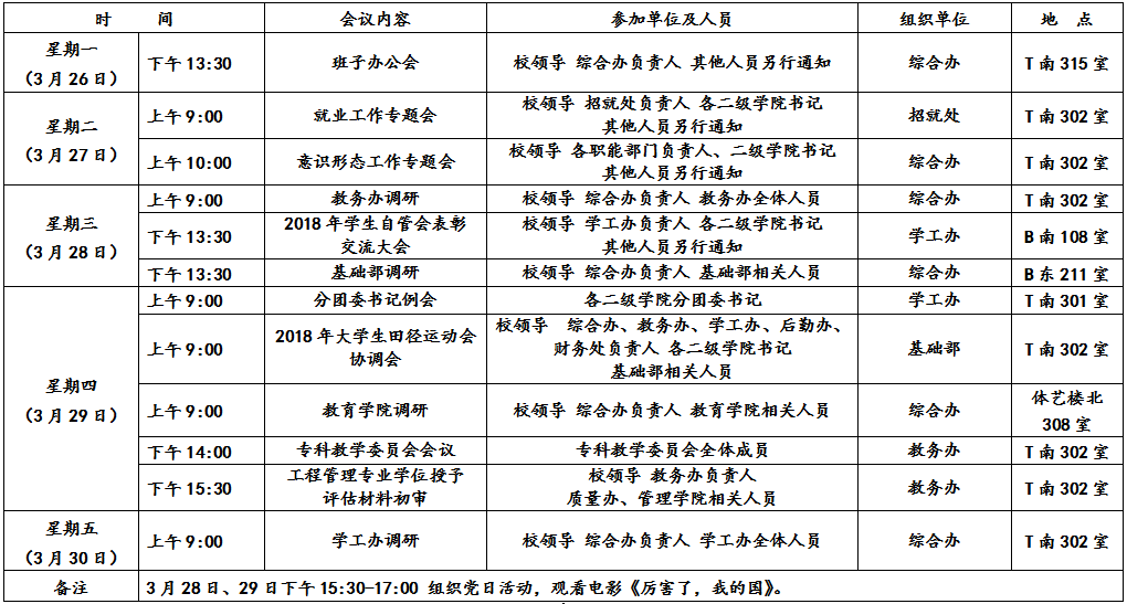 【会表】第四周会议及主要工作安排表(2018年3月26日—3月30日)