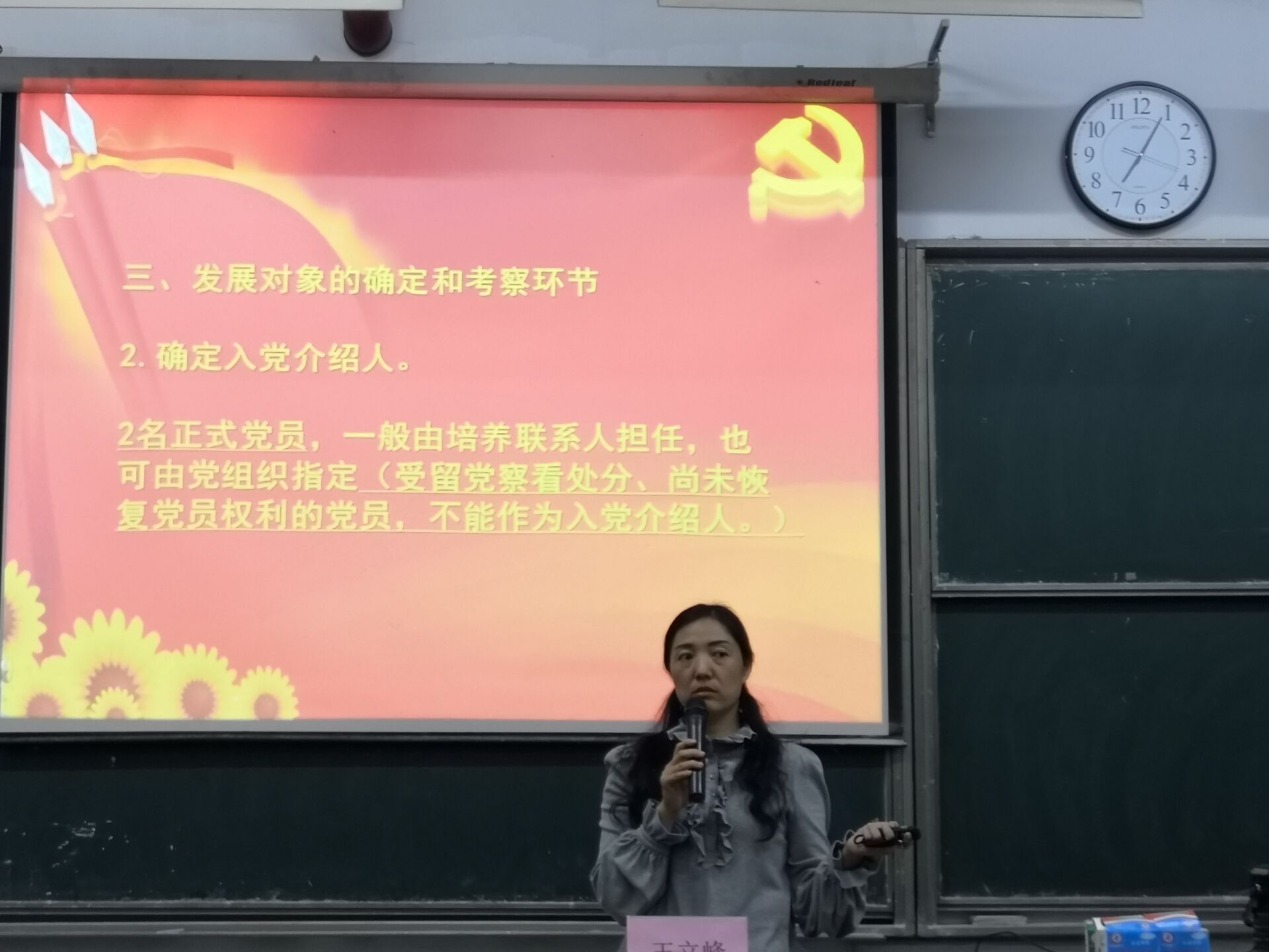 王老师反复强调,申请入党需要每个人积极认真参与。志愿入党的同学需递交入党申请书,群团组织推优,再由党支部委员会集体研究确定为入党积极分子,由党支部指定的培养联系人介绍党的基本知识、政治觉悟、道德品质。入党积极分子需认真听团课、党课,每半年党支部都会对入党积极分子进行一次考察。政治学习情况、集体活动情况、文明宿舍、学分绩点、考证情况、社会实践、获奖情况等都为考察的重点,因此每位入党积极分子需要认真对待学业,兼顾各项发展。