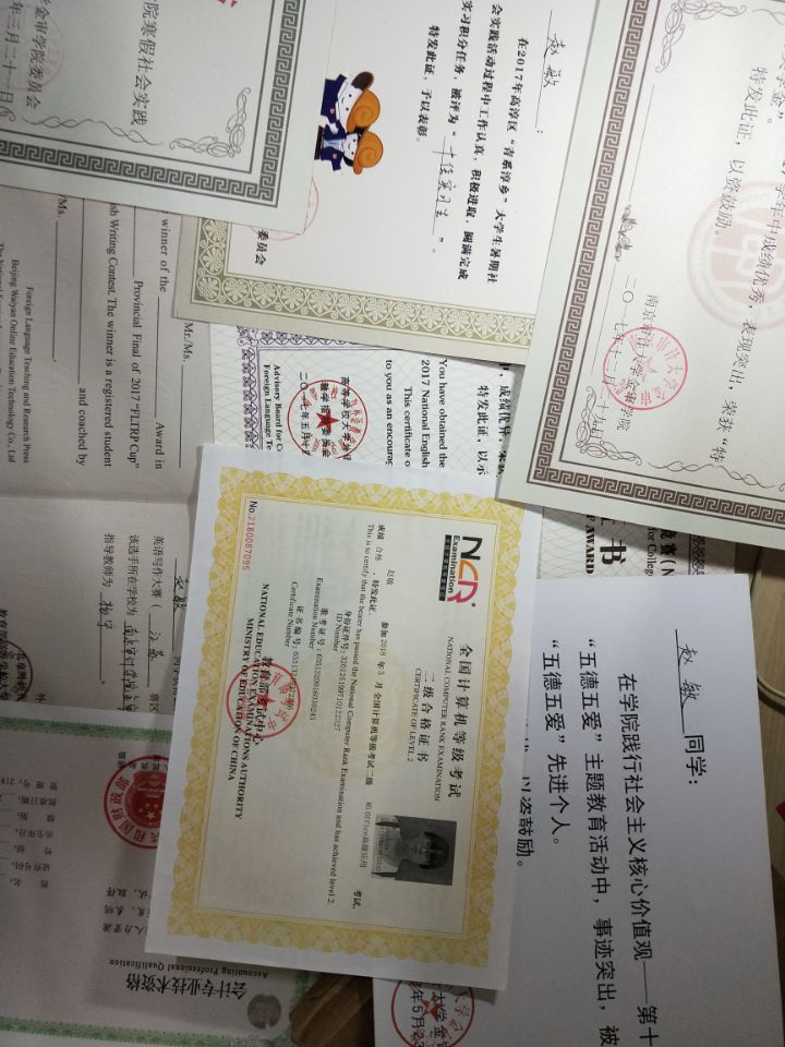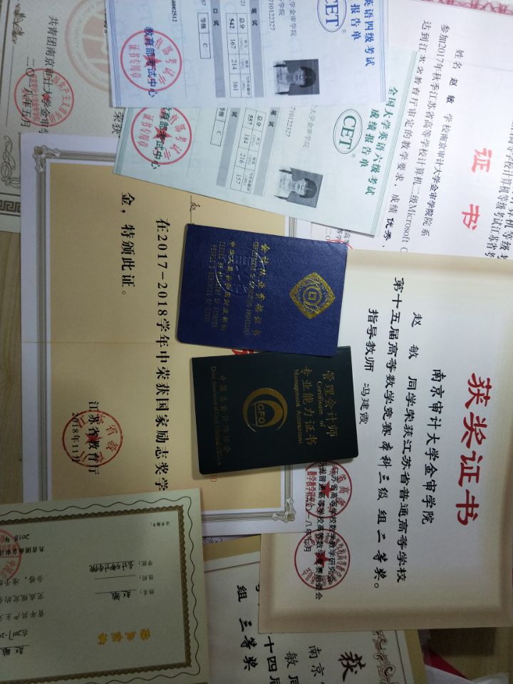 在学习方面,赵敏学姐勤奋好学,一丝不苟,她的绩点高达4.11,成绩保持名列前茅,可谓是个不折不扣的学霸。在学好专业课的同时,她还积极参与数学、英语及各种知识竞赛,考取了多种相关专业证书。俗话说:纸上得来终觉浅,绝知此事要躬行,因此她也积极参加社会实践活动,她在银行和审计局进行过实习,曾获“十佳实习生”称号。众所周知,英语四级六级、计算机等级考试是学生在大学阶段普遍考取的证书,赵敏学姐在已通过这些考试的同时,还获得了多份荣誉成就。2016-2017学年,赵敏学姐考取了会计证、证券从业资格证、数学竞赛三等奖,英语竞赛三等奖、获得了寒假社会实践优秀个人奖、被评为“五德五爱”先进个人、获得三好学生称号、荣获特等奖学金;2017-2018学年取得初级会计职称证、普通话证书、“外研社杯”英语写作大赛初赛特等奖、江苏省三等奖、数学竞赛二等奖;2018-2019学年即本学年,目前已取得基金从业资格证、期货从业资格证、管理会计证、全国大学生会计信息化技能大赛江苏省一等奖、全国三等奖。我们经常会听闻一些关于优秀人士的“传奇故事”,但当近距离的感受这种优秀时,带给你的不仅是目瞪口呆的反应,更是一种源于优秀力量带来的心灵冲击感。