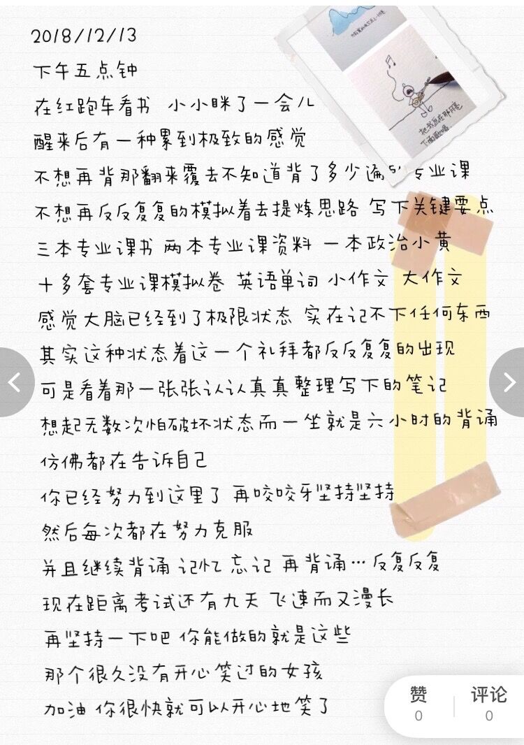 考研是一场漫长而孤独的旅行,你既踏上了这段旅途,便也充满了未知,但是既然选择了去做这件事情,一定要把它坚持到底。坚持这件事情,它不光对你正在做的事情本身有意义,它对你整个人生的很多事情都有意义。所以我所要做的就是坚持住不放弃,然后隐藏欲望埋头努力。那时所走过的日日夜夜里会有很多想法,也想着总有一天要把它说给别人听,可现在回头来看,那个本以为是一场自我内心的伟大革命,现在说出来也已回归平淡,但最重要最有意义的收获便是对待事情都多了一份执着与坚持,这也使我相信,奇迹藏在未曾放弃的坚持里!