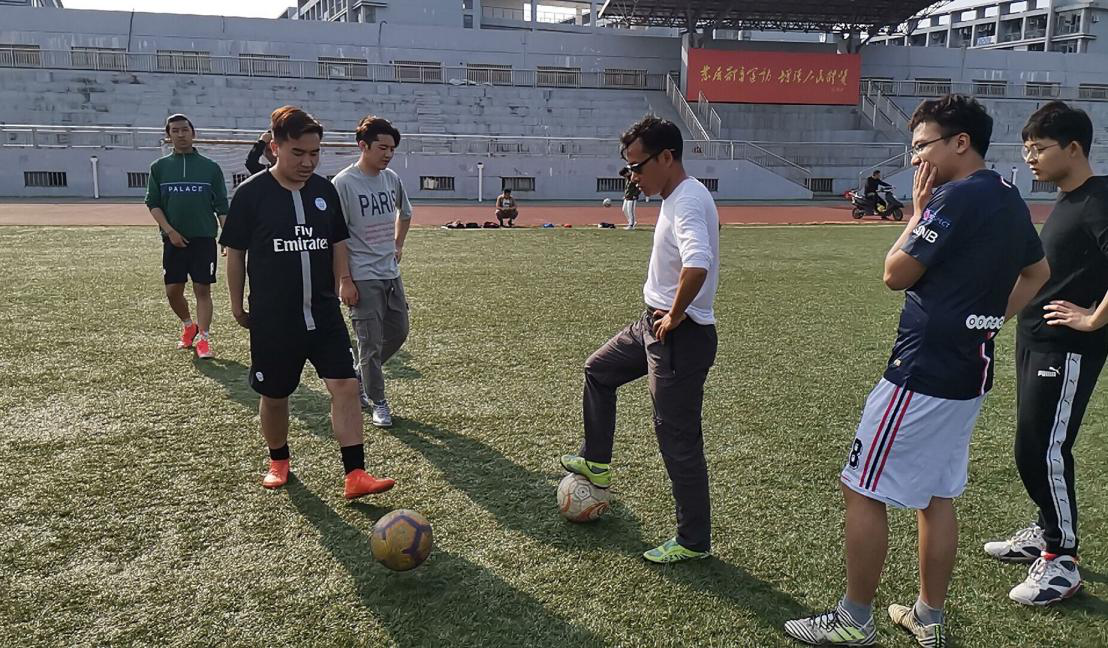纪老师在操场指导足球技巧