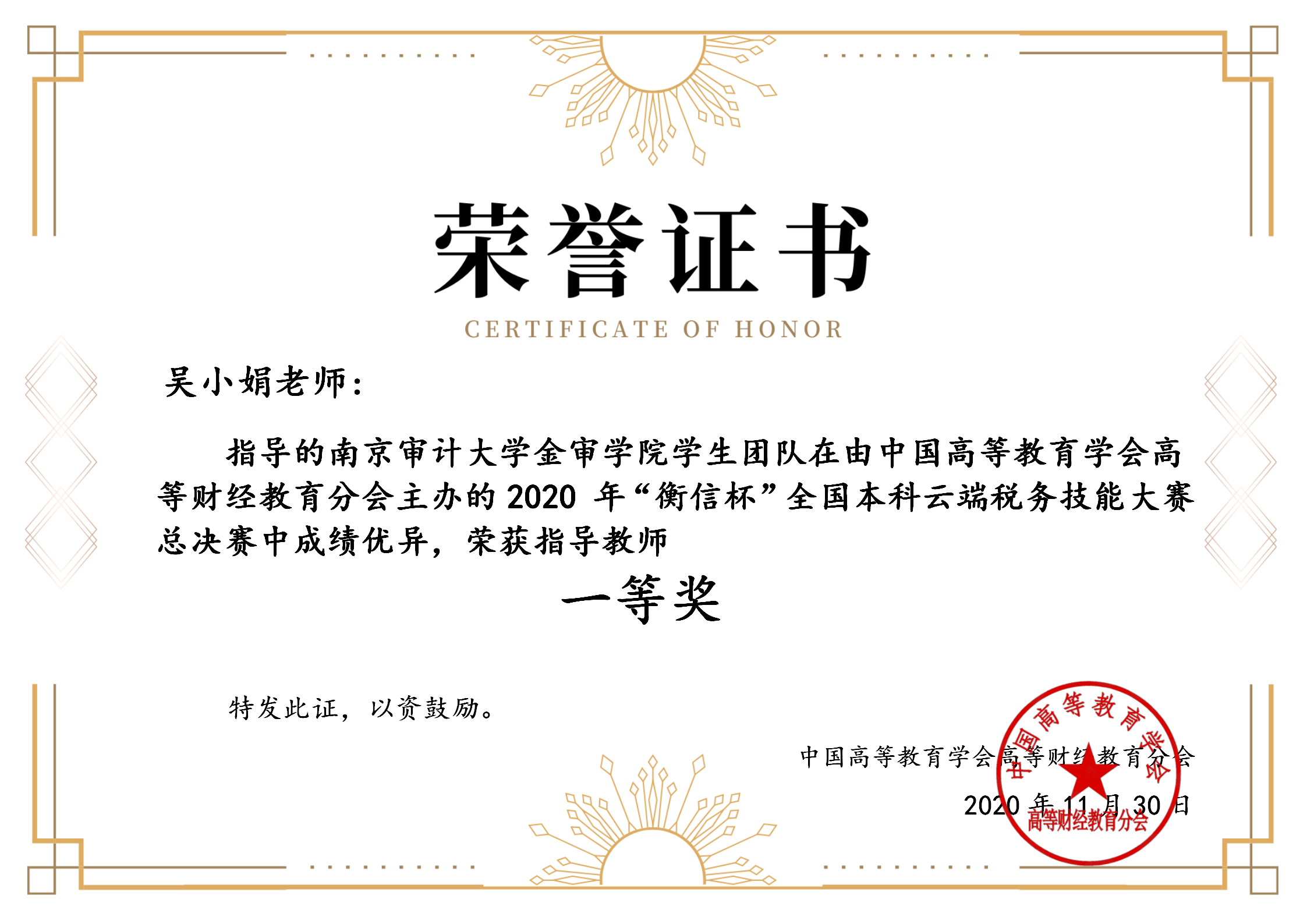 由中国高等教育学会高等财经教育分会主办的2020年“衡信杯”全国本科云端税务技能大赛总决赛于2020年11月28日圆满结束。我校金融与经济学院2018级税收专业范广洋、赖思懿、袁雨新、赵欣然4位同学在税收专业教研室吴小娟老师、王洪艳老师、程剑东老师的指导下,从参赛的全国本科148所院校中脱颖而出,获得团体排名第十名、决赛一等奖的优异成绩,同时三位老师荣获指导老师一等奖。