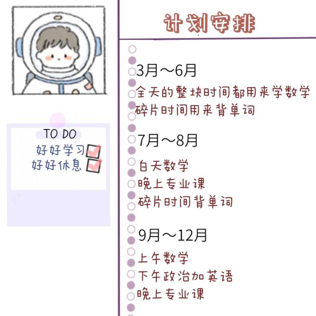 关于“什么时候开始考研复习”这一问题,许多人总是很纠结。有人认为复习应该越早越好,也有人认为太早了反而不利,因为到了后期会很疲惫。张枭宇是在大三寒假的春节后,正式开始准备的。他认为,这个时候开始坐冷板凳、高效率地学习,才能更好地适应枯燥又漫长的考研生活。早在大一时,张枭宇就已确定好目标院校和专业,并且经常浏览网页上的考研经验贴和视频,以此来制定自己的复习计划并购买复习资料。