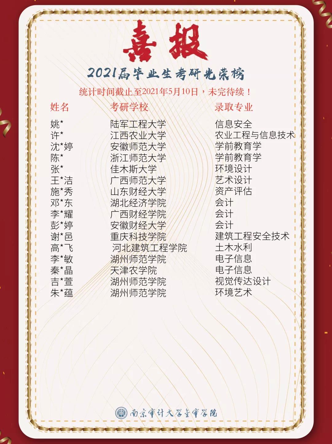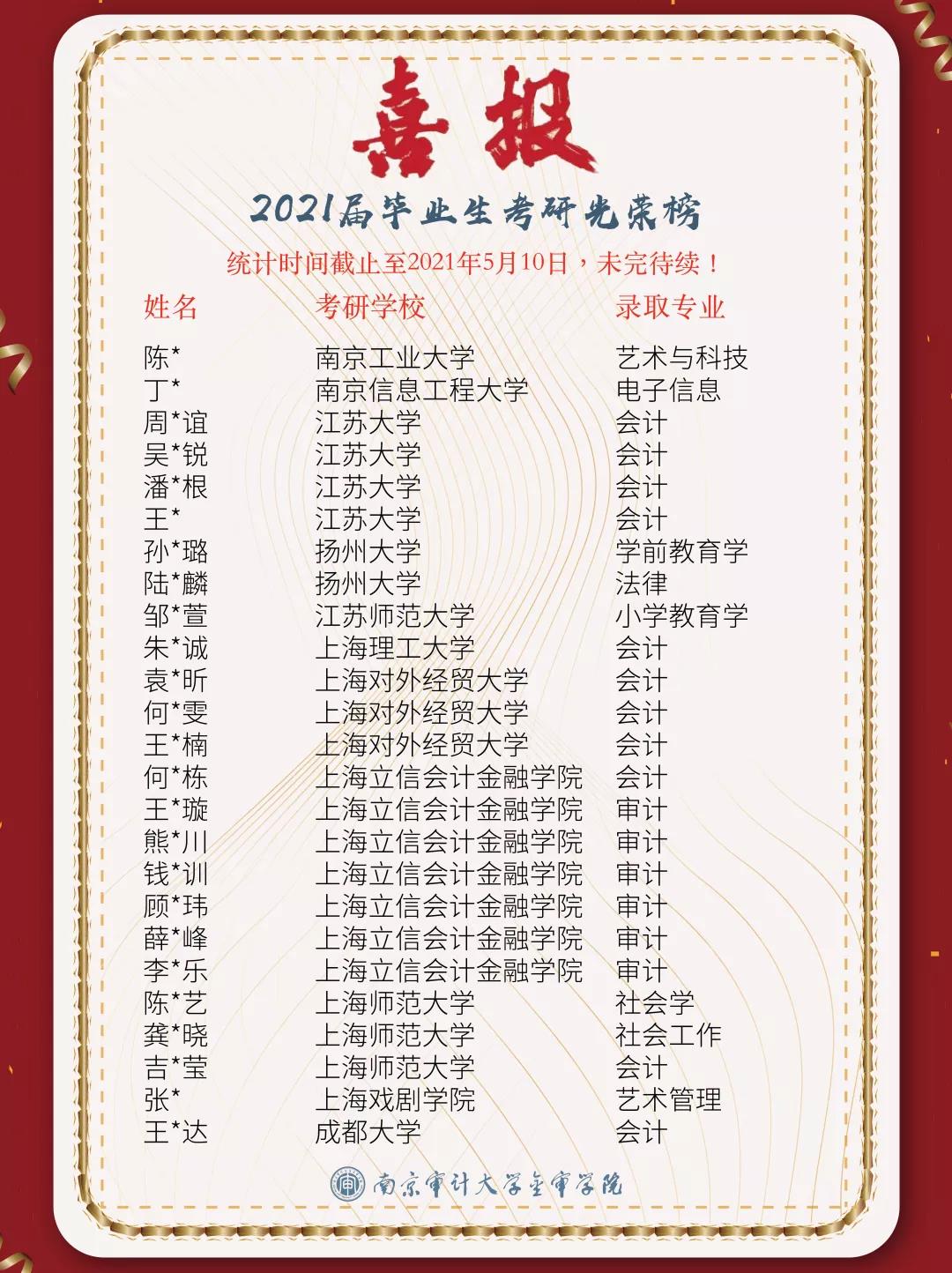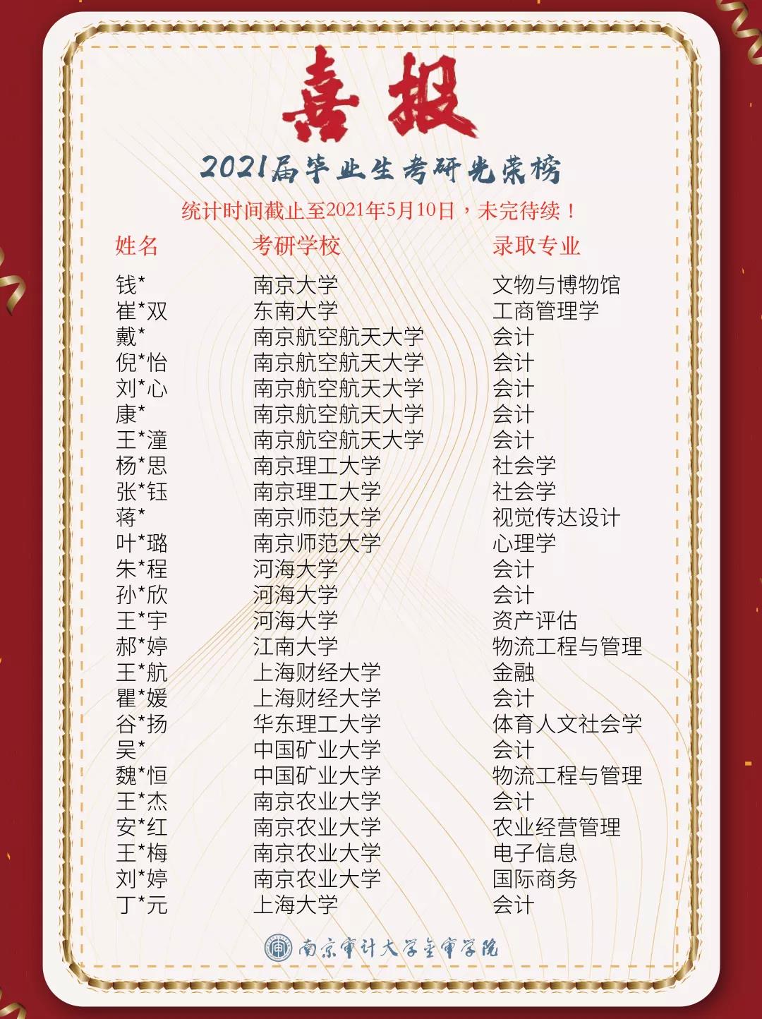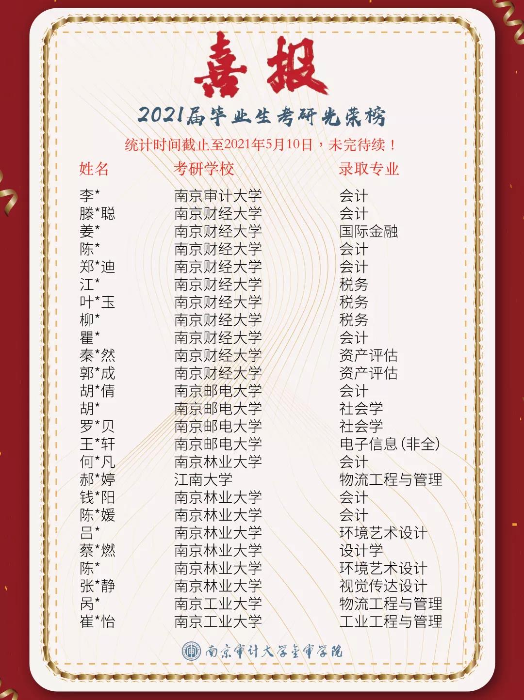 近期,我院考研工作喜讯频传,多位学子考取了南京大学、东南大学、南京航空航天大学、南京理工大学、上海财经大学、伦敦大学学院、墨尔本大学、莫纳什等国内外知名高校。截至2021年5月10日,我院共有215名学生确定录取。这些优异成绩的取得,既是考研学子寒窗苦读、自强不息的结果,也是我院不断提高教学质量,加强内涵建设的充分体现。