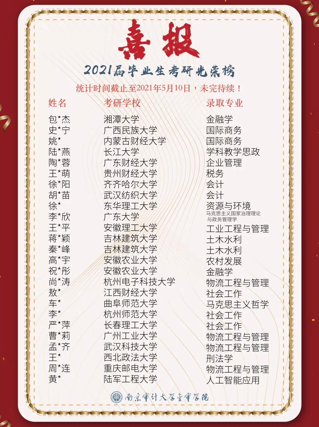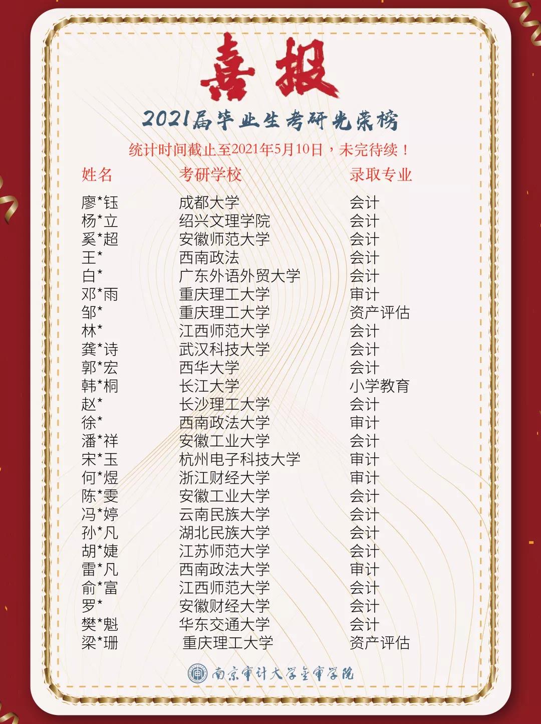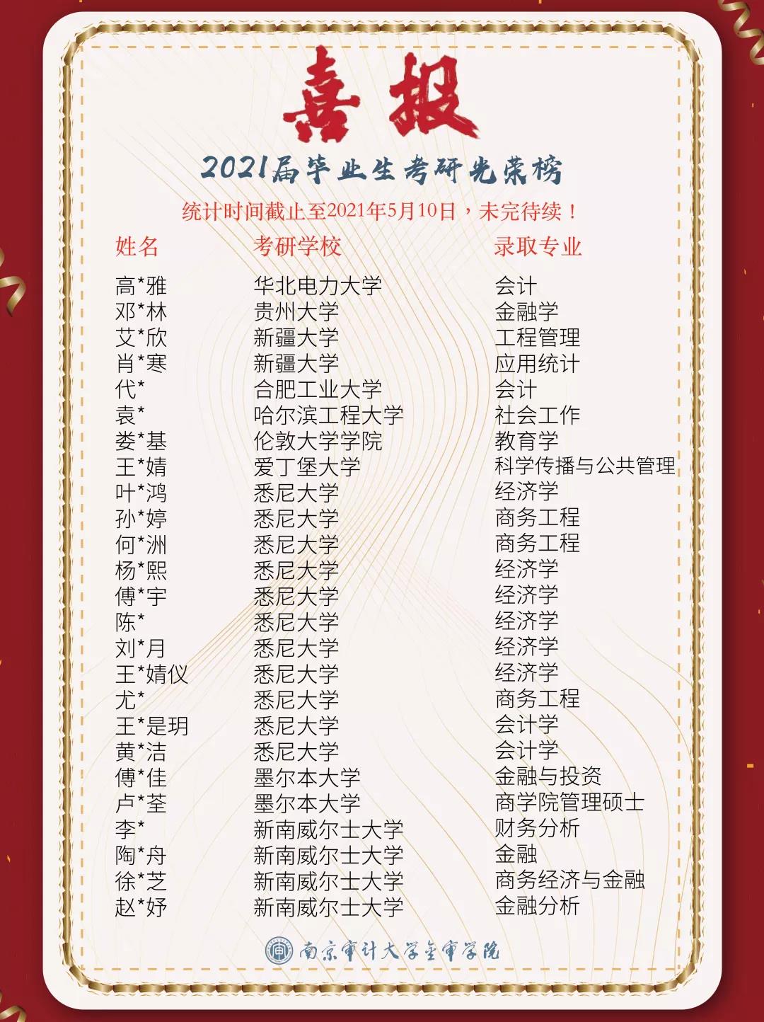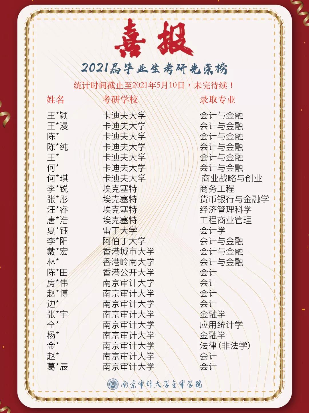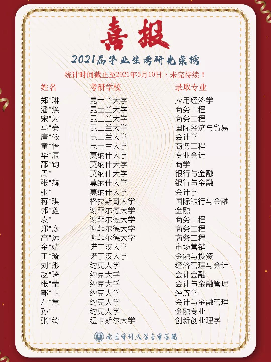 近期,我院考研工作喜讯频传,多位学子考取了南京大学、东南大学、南京航空航天大学、南京理工大学、上海财经大学、伦敦大学学院、墨尔本大学、莫纳什等国内外知名高校。截至2021年5月10日,我院共有215名学生确定录取。这些优异成绩的取得,既是考研学子寒窗苦读、自强不息的结果,也是我院不断提高教学质量,加强内涵建设的充分体现。