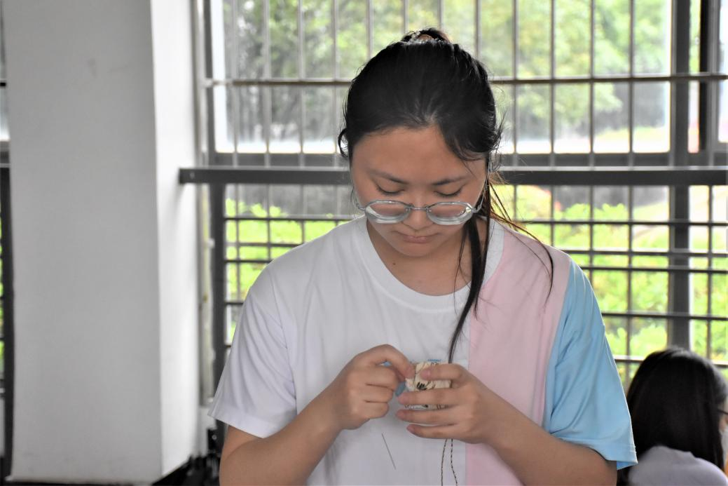 在包粽子环节结束后,同学们转换场地开始了第二个活动——缝香囊。女同学们大显身手,她们一针一线的缝制,将简单的材料变得栩栩如生,一个个小巧精致的香囊就此呈现。针、线所编织的不仅是美丽的图案,更是对屈原的敬佩、思念,以及对未来的期盼。