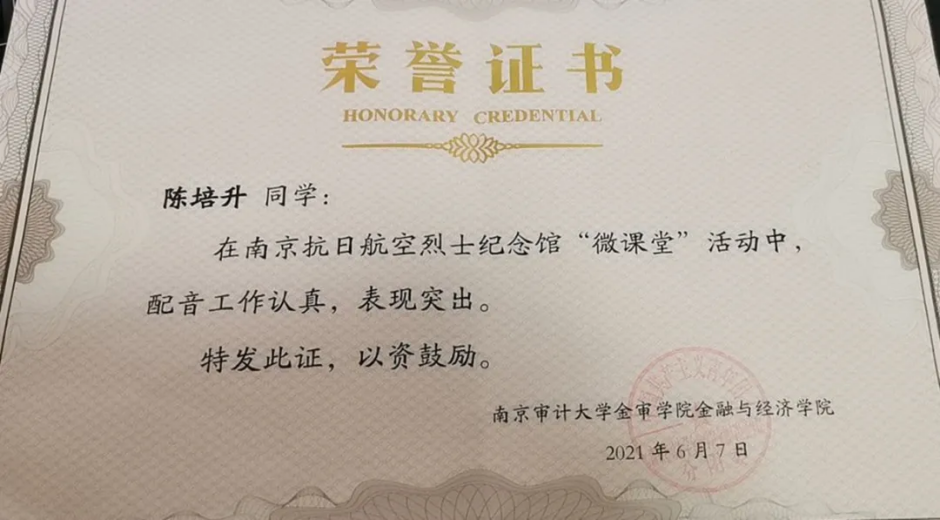 因曾担任校广播台的台长,在老师的引介下,陈培升与校广播台的原岩同学一同成为了纪念馆官方微课堂的配音人员,用他们的声音将先辈们英勇无畏的精神延续。
