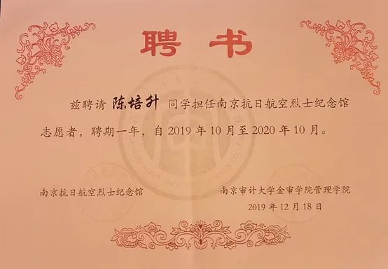 有了南京博物院的服务经验,陈培升报名并通过考核成为了南京抗日航空烈士纪念馆的讲解员,在纪念馆内讲解烈士们的英勇事迹与我国空军的前世今生。