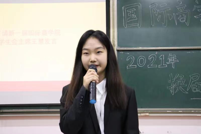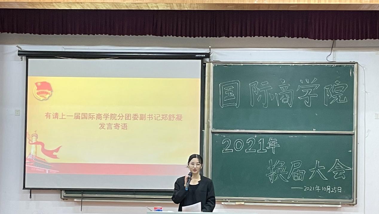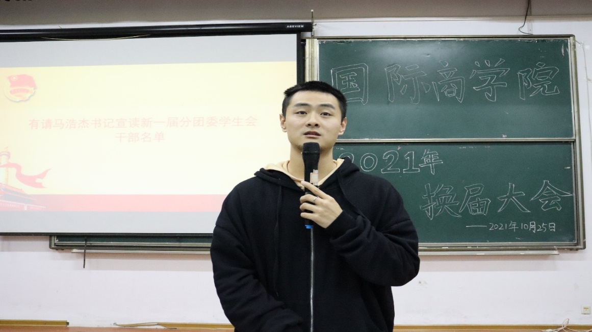 新一届分团委副书记胡潇月通过回忆过往一年团学工作的经历,表达了自己对分团委学生会这个大家庭的深厚情感,并在此次大会中向大家保证:新一届国际商学院分团委学生会将秉承历届的优良传统,稳步推进的同时追求创新发展。