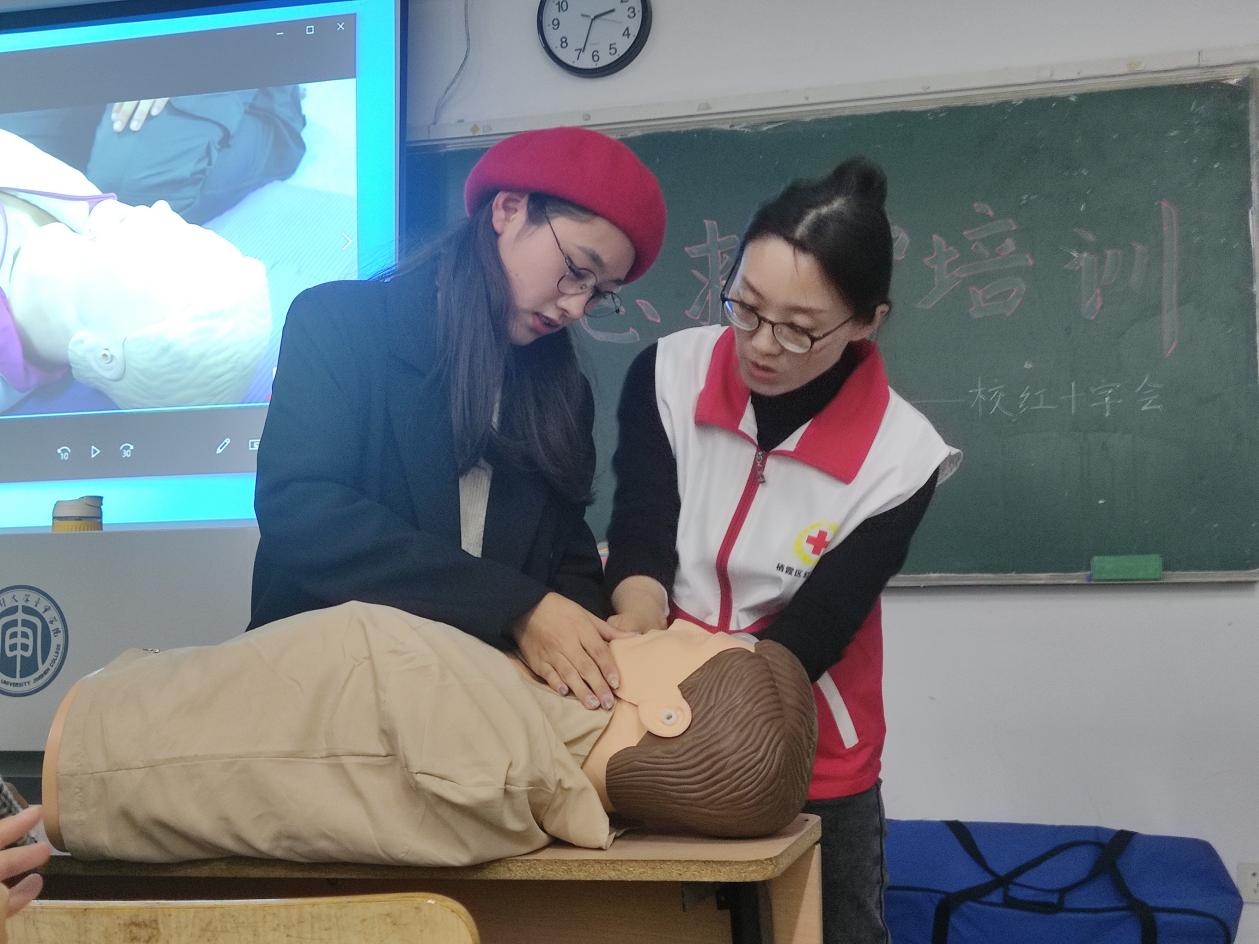 培训班上,红十字会救护培训师以理论学习、现场演示、实践操作等方式进行授课,以近年来发生在身边的鲜活事例,向同学们强调了应急救护“黄金四分钟”的重要性,随后逐一讲解了人工呼吸和心肺复苏(CPR)步骤,介绍了自动体外除颤器(AED),向广大新生普及急救知识,提升新生们的紧急救护能力。