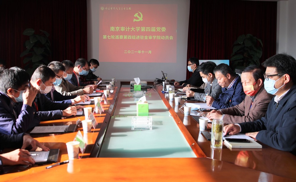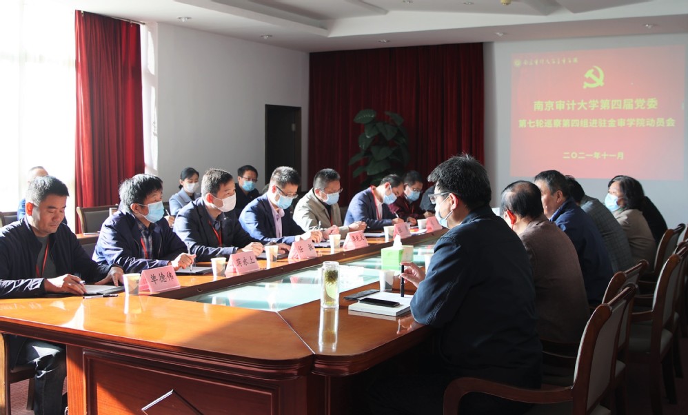 11月18日, 按照学校党委统一部署,南京审计大学第四届党委第七轮巡察第四巡察组召开进驻金审学院巡察动员会。学校巡察领导小组领导同志、第四巡察组全体成员、校师德师风建设专项检查组成员, 金审学院全体院领导、学院党委委员和纪委委员、学院各二级党总支书记、直属党支部书记、各二级学院负责人、职能部门负责人参加了会议。第四巡察组组长张勇通报巡察任务和总体安排,南京审计大学常委、组织部长、校巡察领导小组办公室主任李乾文就做好本次巡察工作提出要求,金审学院党委书记卢加元主持会议并作表态发言。