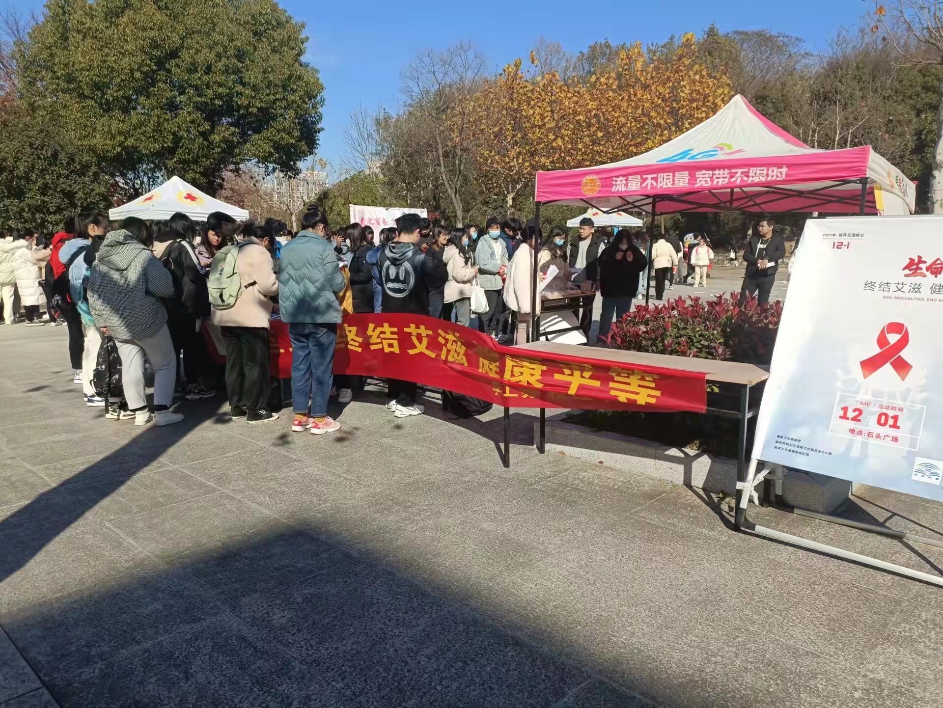 广场宣传活动中,红十字会的志愿者们在暖阳下积极传递爱心,现场发放各类防艾宣传资料。同学们积极主动在签名墙上签下独特的防艾心语,防艾知识问答及抽奖环节等都吸引大家的注目。
