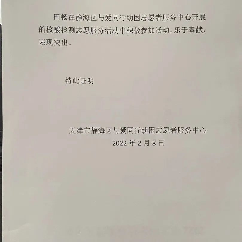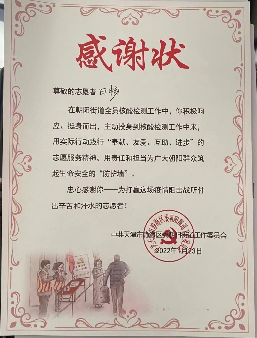 疫情就是命令,防控就是责任。腊八当天,寒风呼啸、天气骤冷,静海区开始全员首次核酸检测。在疫情肆虐的日子里,有着众多白衣天使和万千逆行者负重前行,作为一名光荣的共青团员,作为家乡的一份子,我必当竭尽全力为社会、为家乡奉献本人的一份绵薄之力。在接到通知后我第一时间投身志愿服务,即使经常来不及吃饭也要冲往一线,我秉承“奉献、友爱、互助、进步”的志愿精神迎难而上,时刻彰显新时代大学生激昂的斗志和精神面貌,得到了一线人员和广大群众的认可。