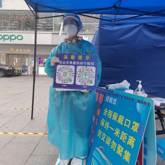 作为一名社区核酸检测工作的志愿者,我们穿上一整套的医疗防护服,做好核酸工作的“前两道关卡”——测体温、检查来往人员的健康码和行程码,并扫描核酸码。一整天的工作有些枯燥无味,却是为安全加了一道防线。