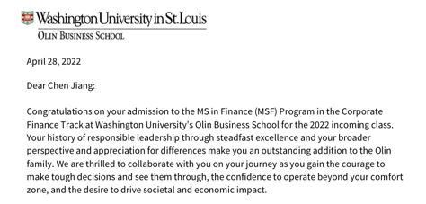 四年来,坚定的目标让她的前路不迷茫,她把更多时间放到磨砺自己身上,最终收获了来自美国约翰霍普金斯大学、圣路易斯华盛顿大学、波士顿大学、UIUC、澳洲墨尔本大学、悉尼大学、英国诺丁汉大学的offer。