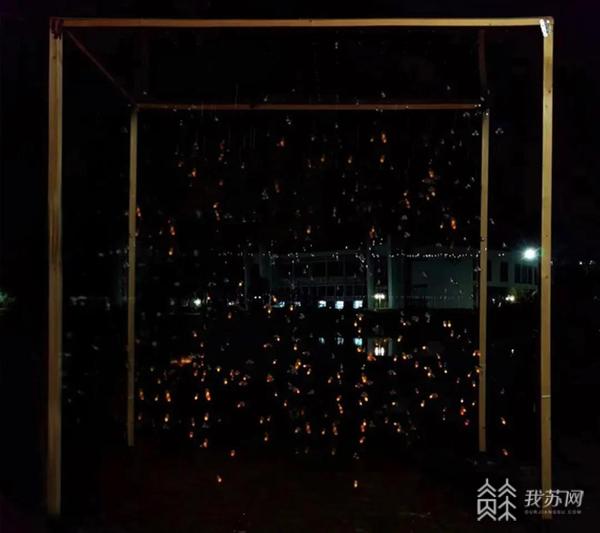 这件以《萤火》为题的作品,采用松木框架,其上置透明亚克力板,共有162孔,用鱼线垂吊下来,尾部连黄色小灯,似萤火虫般。为保证鱼线下垂丝滑,线上加有小葫芦形夜光沙水磨石,白天吸收太阳光储存能量,夜晚释能发光。人们可以拨开鱼线,在其中穿梭进行亲密互动,在夜晚感受萤火丛中的星空魅力。