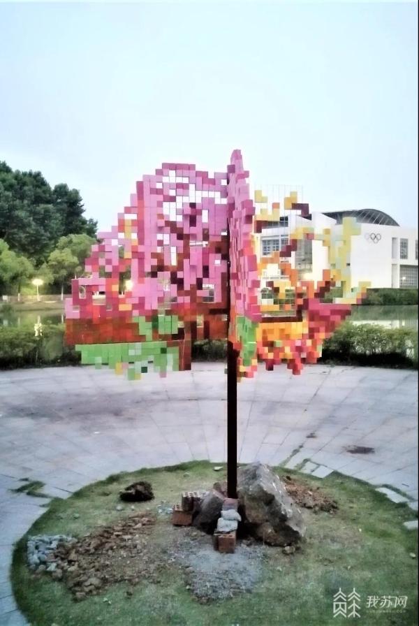 这件作品名叫《时间不过一棵树》,通过像素化的艺术表现手法,使用彩色泡沫方块,展示了一年四季树的不同样貌,夏天郁郁葱葱的树叶变成了秋天的落叶,而秋天的落叶又成为明年春天生长季节的营养源,通过装置巧妙地说明了这种时间的流逝与生长,提醒同学们要善于发现和珍惜当下的美好。