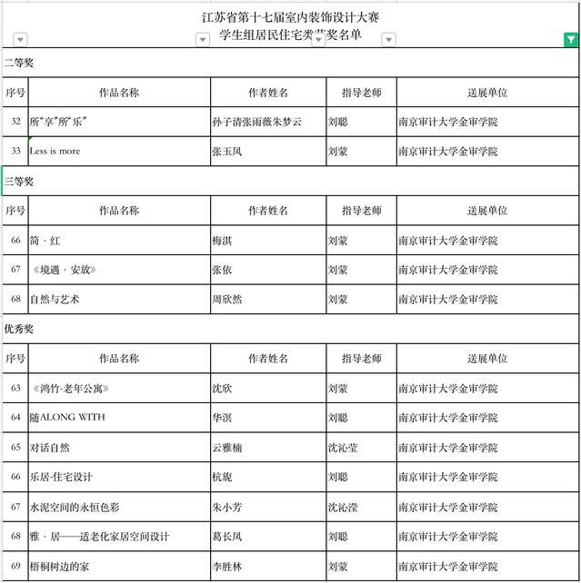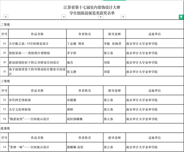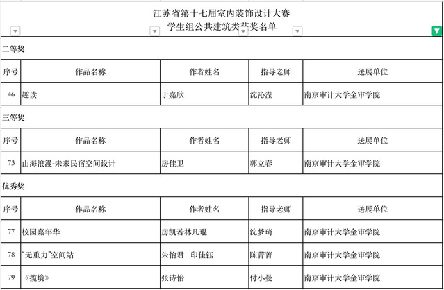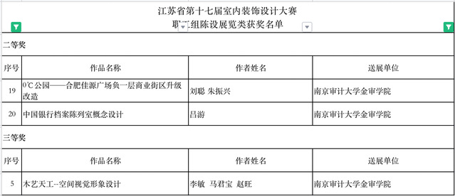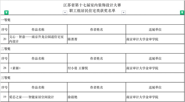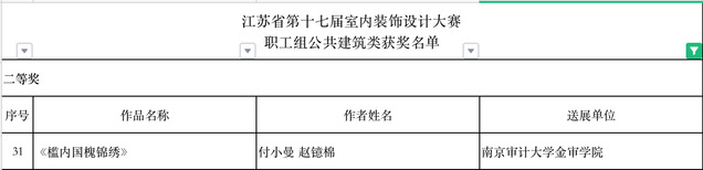 由省人力资源和社会保障厅、省总工会、省室内装饰协会联合主办的江苏省一类职业技能竞赛“江苏省第十七届室内装饰设计大赛”获奖作品公布。江苏省室内装饰设计大赛作为一年一度的“百万技能人才技能竞赛岗位练兵活动”之一,已连续成功举办十七届,因参赛选手范围广、参赛作品水准高、评选流程严谨而获得业界一致认可。来自省内各市县的装饰公司、设计研究院所、省各重点大、专院校的室内装饰设计院系或学科组申报的1544件设计作品参加了本次大赛评选。大赛设公共建筑、居民住宅、陈列展览三类奖项,并根据申报单位的不同分成职工组、学生组两组进行评选。本专业递交的师生参赛作品共获得1项一等奖、10项二等奖、9项三等奖、11项优秀奖的成绩。