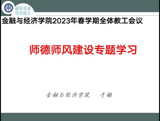 为进一步加强学院师德师风建设、筑牢师德底线,立德树人、廉洁从教,2023年3月22日,金融与经济学院在C西403开展师德师风专题学习会议。本次会议由金融与经济学院于璐书记主持,学院全体教师参加。