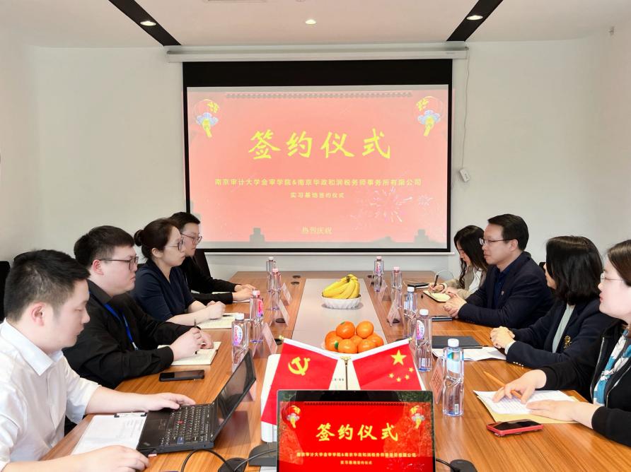 为不断拓展学生就业空间,促进毕业生高质量就业,2023年4月13日下午,我校会计与审计学院与南京华政和润税务师事务所校企合作签约仪式如期在南师大紫金校区产业园展开,会计与审计学院党总支书记庄怀军、副院长仲怀公及会计与审计学院吴学翠、关涵老师参加签约仪式。南京华政和润税务师事务所董事长顾润埥、业务经理朱弘磊、项目经理桑江威、行政经理陈琦参加此次活动。