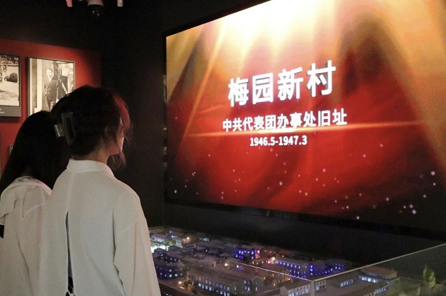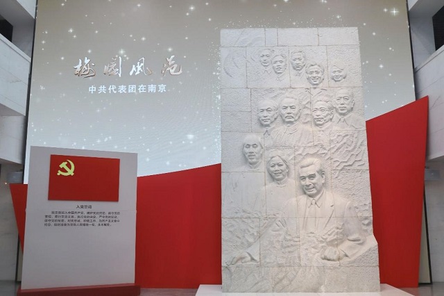 步入梅园新村新馆,庭院中正对大门立着周恩来同志的全身铜像,铜像挺拔坚定、气质从容,凝聚着周恩来同志沉着机智的革命家风度;迈入大厅,汉白玉浮雕上雕刻着中共代表团的领导同志——周恩来、邓颖超、董必武、吴玉章、叶剑英、陆定一和李维汉等,他们名字的排列像一个倒“S”形,象征着中国革命走过的道路艰难曲折,也预示着中国革命事业将继往开来,千秋万世永传承。