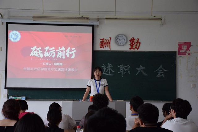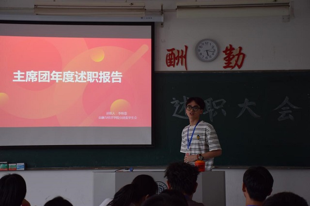 本次大会由金融与经济学院分团委学生会组织,金融与经济学院党总支副书记吴萍、分团委书记郭秋平出席会议。会议首先由各部门部长及副部长进行工作汇报,通过PPT展示了各自部门丰富多彩的活动剪影,并站在宏观的角度总结了自己部门一年的整体工作情况、工作内容、举办活动的次数和经验,具体落实到每一次工作计划、安排、执行情况,从工作中总结反思,从反思中创新理念。