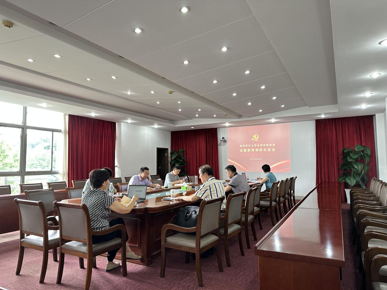 党委书记蔡雪辉指出,主题教育开展以来,在南京审计大学党委的领导和部署下,金审学院党委立足工作实际,根据主题教育方案安排,扎实开展各项工作,围绕以学铸魂、以学增智、以学正风、以学促干根本任务,坚持理论学习、调查研究、推动发展、检视整改有机融合、一体推进。四月以来,学校党委围绕“三进三解”工作要求,在全校范围内开展线上问卷调查,形成问题清单,拟定调研提纲、细化调研分工、制定调研方案。调研组深入各二级学院、机关、各部门,紧扣“将学习成效切实转化为推动学院转型提升的能力和本领”“促进毕业生就业工作”等问题,通过座谈、走访等形式开展调查研究,把调研结果与学院发展实际相结合,深入分析、充分论证、科学决策,形成最终的问题清单、责任清单、任务清单,研究对策措施,切实推动解决问题,以期形成长效机制。