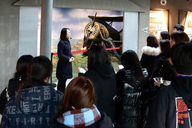 昭昭前事,惕惕后人,前事不忘,后事之师。同学们跟随指引前往展览馆,途中经过的空地上挺立着一比一仿照当时的美国战斗机和白色机棚,战机虽老,精神永存。讲解员介绍了飞行英雄们的事迹,大家纷纷表示要牢记革命先烈英勇不屈的革命故事,传承英烈风骨,历史不可忘怀,爱国的信念坚不可摧。