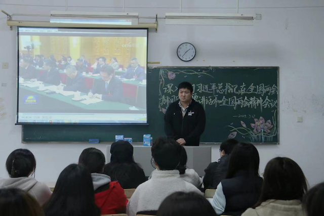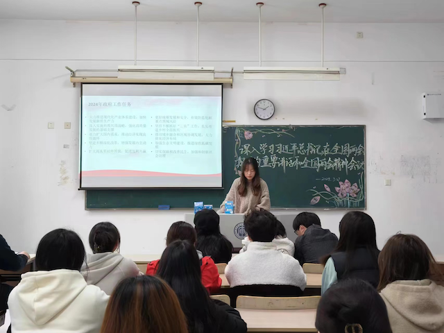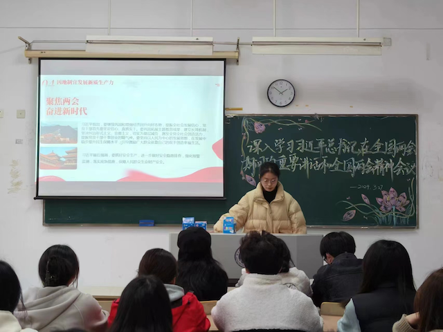 学生们纷纷表示要深刻学习贯彻两会精神,凝聚力量,坚定信心,努力学习,奋发向上,为推进中国式现代化贡献智慧和力量。学生代表冯佳琪说,要充分发挥党员先锋模范作用,锤炼过硬本领,用鲜活的青春梦想和实际行动回馈祖国,用热情和激情谱写“强国有我”的青春篇章。学生代表李子怡说,吾辈青年重任在肩,应当责无旁贷,勇挑重担,将所学知识与国家和社会发展结合起来,为建设社会主义现代化强国贡献青春力量。