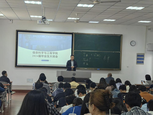 根据教学工作安排,信息学院2020级各专业同学于4月20日全部返校。为组织好学生毕业前的各项工作,帮助同学们在最后两个月的校园时光里取得更大的收获,4月22日下午,学院于C南101召开了2024届毕业生大班会。学院领导和毕业班辅导员老师以及全体2020级同学参加会议。