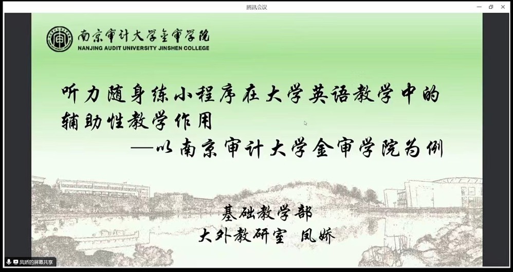 4月24日,南京审计大学金审学院基础教学部大外教研室主任凤娇副教授应邀出席由上海外语教育出版社主办的“智慧平台助力听力教学改革”系列讲座,讲座的主题为“实践与分享:用好‘听力随身练’系统,助力听力教学改革”。