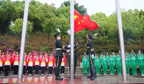 伴随着雄伟庄严的《义勇军进行曲》,五星红旗冉冉升起。国旗飘扬,国歌雄壮,全场肃穆,行注目礼。