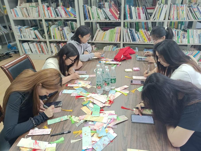 通过精心的挑选,仔细调配的颜色,用心绘制的图案而得到的书签,将对党员毕业生们满满的祝福和期许融入其中。经过一段时间的忙碌,一枚枚精美绝伦的书签终于得以完成。
