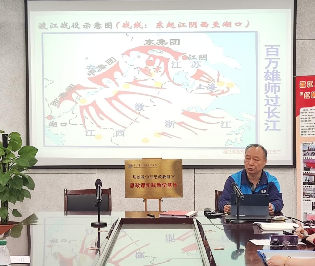 在双方签署党建共建协议及思政教研室思政课实践教学基地签约揭牌之后,思政教学团队按计划开展实践教学活动,由南京审计大学金审学院基础教学部钱振勤教授向各位党员老师及同学作深入学习渡江战役革命精神的报告。今年是渡江战役胜利75周年,渡江战役的伟大胜利,孕育了以“坚定信念、敢于胜利、军民团结、革命到底”为核心内容的渡江精神。通过钱振勤教授生动形象的报告与讲解,各位党员老师及同学们备受鼓舞,传承红色基因,激发奋进力量。