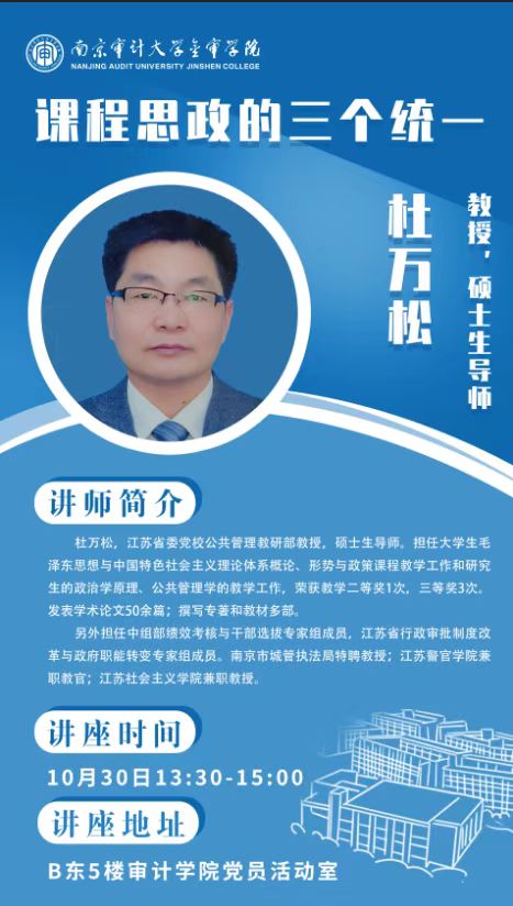 为进一步深化审计学科课程思政工作体系、教学体系和内容体系的建设和改革创新,10月30日,审计学院在B东506党员活动室,开展了一场以“课程思政教学要做到三个统一”为主题的课程思政专题讲座。此次讲座由江苏省委党校公共管理教研部教授、硕士生导师杜万松主讲,学校副校长、博士生导师尹平、学院副院长和秀星、副院长仲怀公、党总支副书记张驰以及学院相关老师参加讲座。