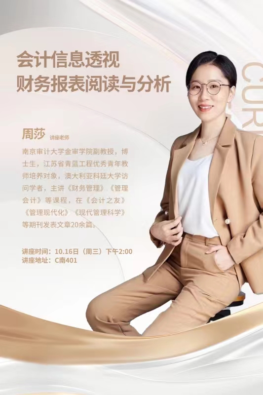 为提高学生对会计信息在财务报表分析中的理解与应用能力,院会计学院专业社团智财挑战社于10月16日在C南401举办“会计信息透视财务报表阅读与分析”专题讲座。本次讲座邀请了南京审计大学金审学院副教授周莎作为主讲嘉宾。