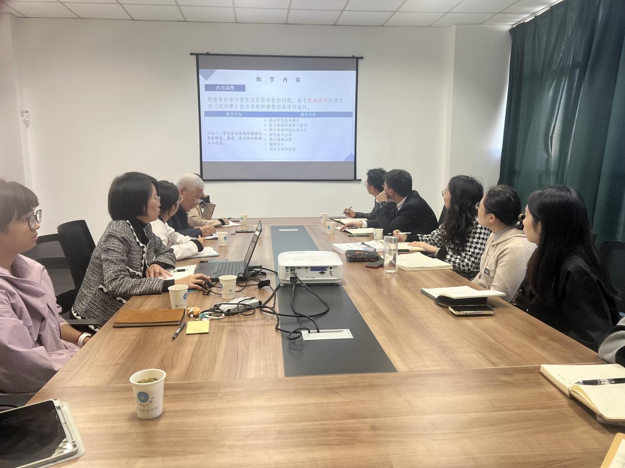 《统计学》课程组负责人章国美老师从课程简介、教学内容、考核方式和教学效果等方面汇报了《统计学》课程建设情况。课程组针对《统计学》课程建设新需求和存在的问题,基于反向设计理念对《统计学》能力目标和课程内容进行整合设计,并通过线上线下混合式教学模式开展教学,提高学生学习主动性,满足学生个性化需求。杨新房处长在听取汇报后指出,《统计学》课程是一门非常重要的学科基础课,不仅授课规模大,而且与学生的专业课学习及提高毕业论文质量息息相关,因此,《统计学》课程应该明确教学目标,除了使学生掌握统计数据搜集、整理和分析的基本技能,还要兼顾学生运用统计软件进行统计数据分析和处理的能力,并将学到的统计分析方法应用到毕业论文写作当中,提高论文写作质量。