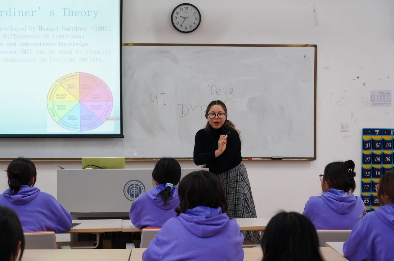 讲座伊始,Deya老师就向我们介绍了霍华德·加德纳理论,并详细讲解了8种学习风格与多元智能。她通过有趣易懂的讲解与丰富的交流互动,在问答中促进了同学们对于自身情况的思考,无形之中为同学们的未来规划指明了路线。同时,全英文的讲解与沟通也提升了同学们的口语能力,加强了用英语交流的自信心。