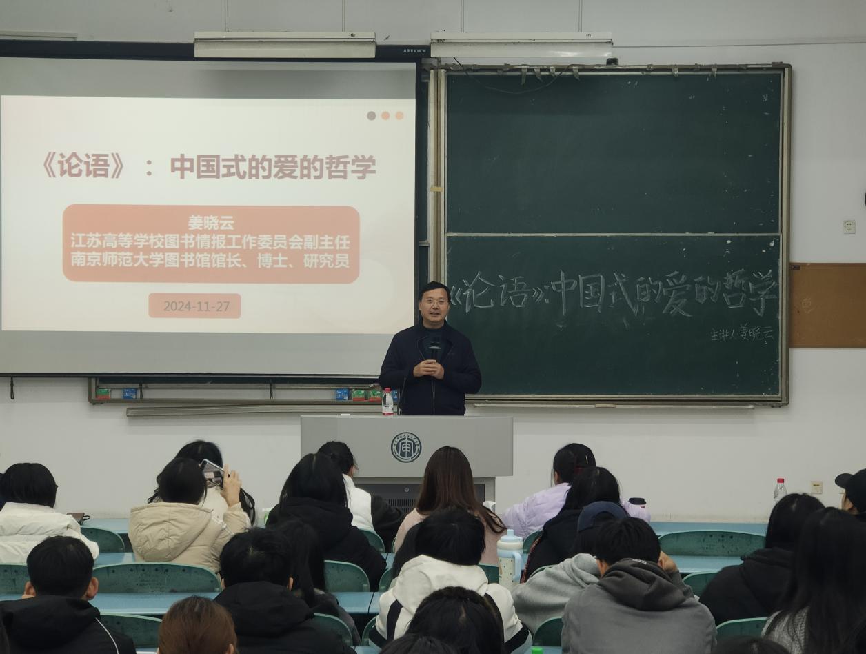 为加强学生干部队伍建设,将提升学生干部的综合素质与中华优秀传统文化相结合,2024年11月27日下午3:30,审计学院(国际教育学院)为期2个月的第10期学生干部培训班第七讲在B南208开讲,本次特邀主讲嘉宾是江苏高等学校图书情报工作委员会副主任、南京师范大学图书馆馆长姜晓云博士,本次主题是“《论语》:中国式爱的哲学”,我院24级班干部及分团委、学生干部参加,现场气氛热烈。