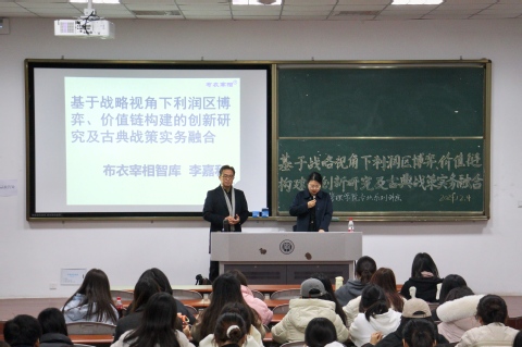 12月4日下午,管理学院在C楼102教室成功举办了主题为“基于战略视角下利润区博弈、价值链构成的创新研究及古典战策实务融合”的专题讲座。此次讲座邀请了“布衣宰相智库”猎头品牌联合创始人李嘉和先生作为主讲嘉宾,为师生们带来了一场精彩的知识盛宴。