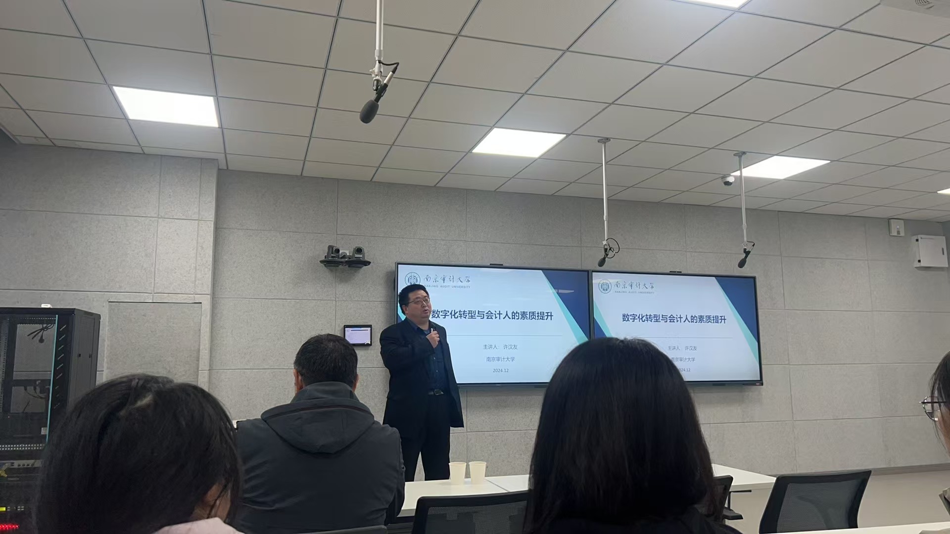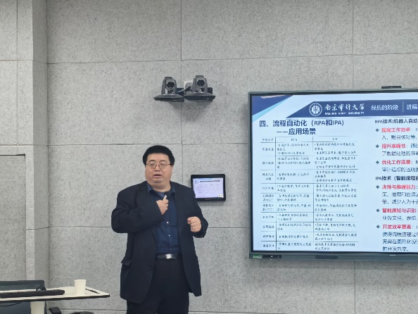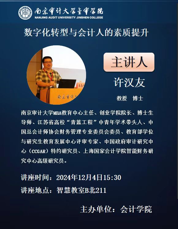 在企业数字化转型浪潮的推动下,会计行业正经历着前所未有的变革,如何培养社会亟需的智能财务人才非常重要。12月4日下午15:30,会计学院邀请南京审计大学许汉友教授作为主讲嘉宾,在智慧教室B北211开展了“数字化转型与会计人的素质提升”的专题讲座,旨在深入探讨数字化转型对会计行业的影响及会计人员如何提升自身素质。讲座由会计学院院长吴中春教授主持,会计学院全体教师和部分学生骨干认真聆听了讲座。