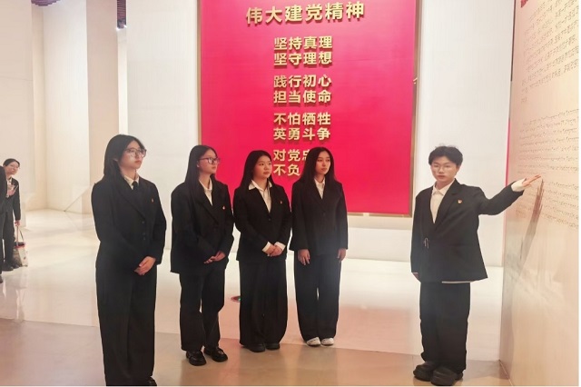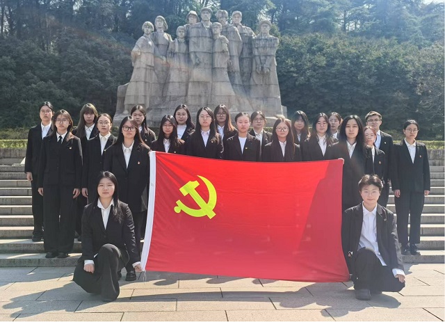 松柏苍翠荫陵园,丰碑矗立忆英魂。雨花台烈士纪念碑前,同学们全体肃立,高唱国歌,向烈士敬献鲜花,用实际行动表达对英烈的崇敬与追思。在《国际歌》激昂奋进的旋律中,党支部学生代表带领大家重温入党誓词,以铿锵有力的誓言坚定了“植根人民,服务人民”的决心。