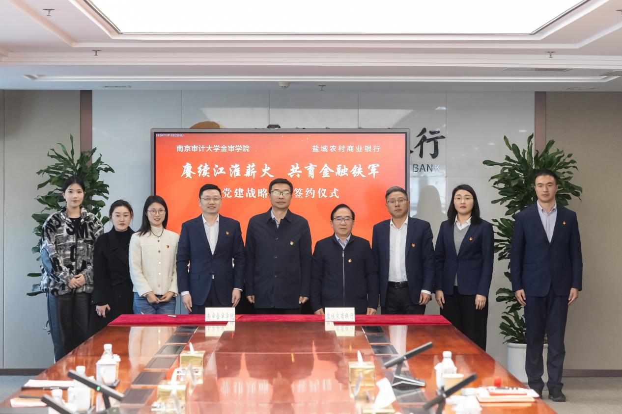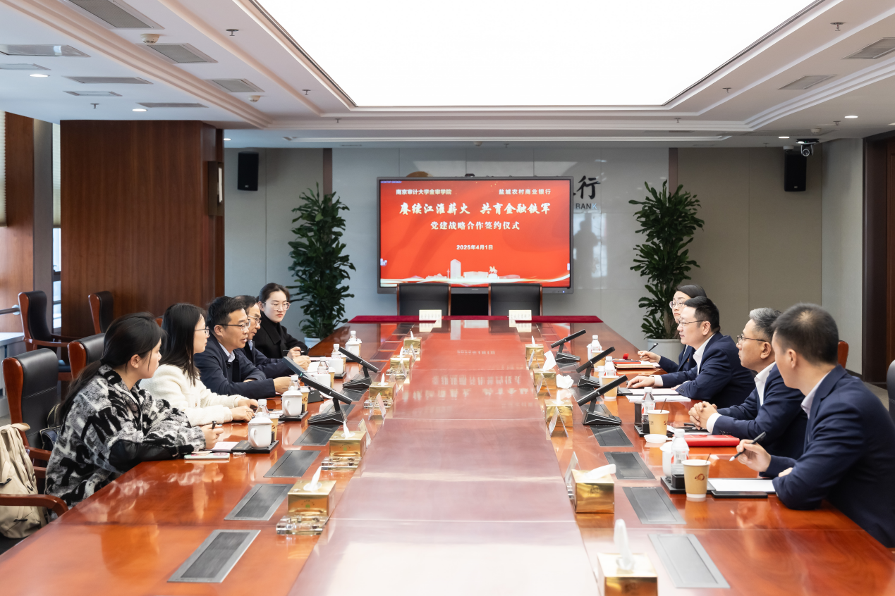 为全面贯彻党的教育方针,落实《习近平新时代中国特色社会主义思想学习纲要》要求,深入践行党的二十大和二十届三中全会关于教育改革和产教融合的部署,坚持把立德树人作为教育的根本任务,进一步探索党建引领下的产教融合共建模式,2025年4月1日,南京审计大学金审学院与盐城农商银行党建共建暨红色金融教育合作签约仪式在盐城农商银行隆重举行。南京审计大学金审学院党委书记蔡雪辉,南京审计大学金审学院金融与经济学院院长蔡则祥,盐城农商银行党委书记、董事长许闯,党委委员、副行长陈旭等出席活动。