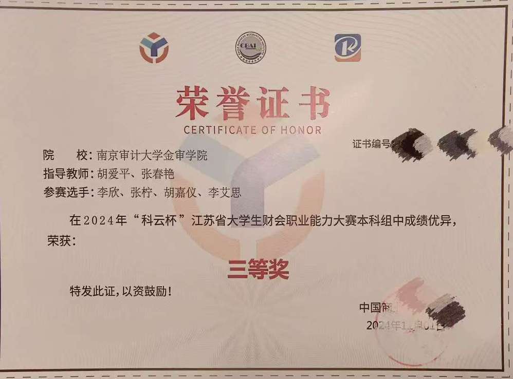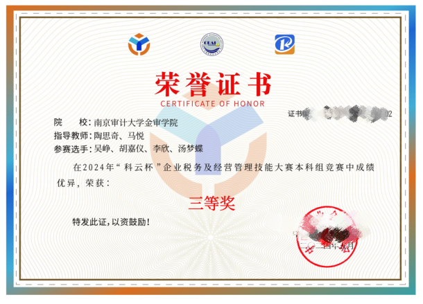 在专业学习上,她始终脚踏实地,勤奋刻苦。连续三年专业学分绩点在专业名列前茅,综合素质测评位列专业前1%。凭借扎实的专业知识和不懈的努力,她多次获得奖学金,如校二等奖学金、德基企业奖学金等。她深知理论与实践相结合的重要性,积极参加各类专业竞赛,在比赛中锻炼自己的实践能力,曾荣获科云杯”企业税务经营管理技能全国三等奖和“科云杯”全国大学生财会能力大赛全国三等奖。这些荣誉的背后,是她无数次的钻研与付出,也让她在专业领域不断成长,为未来的职业发展奠定了坚实基础。