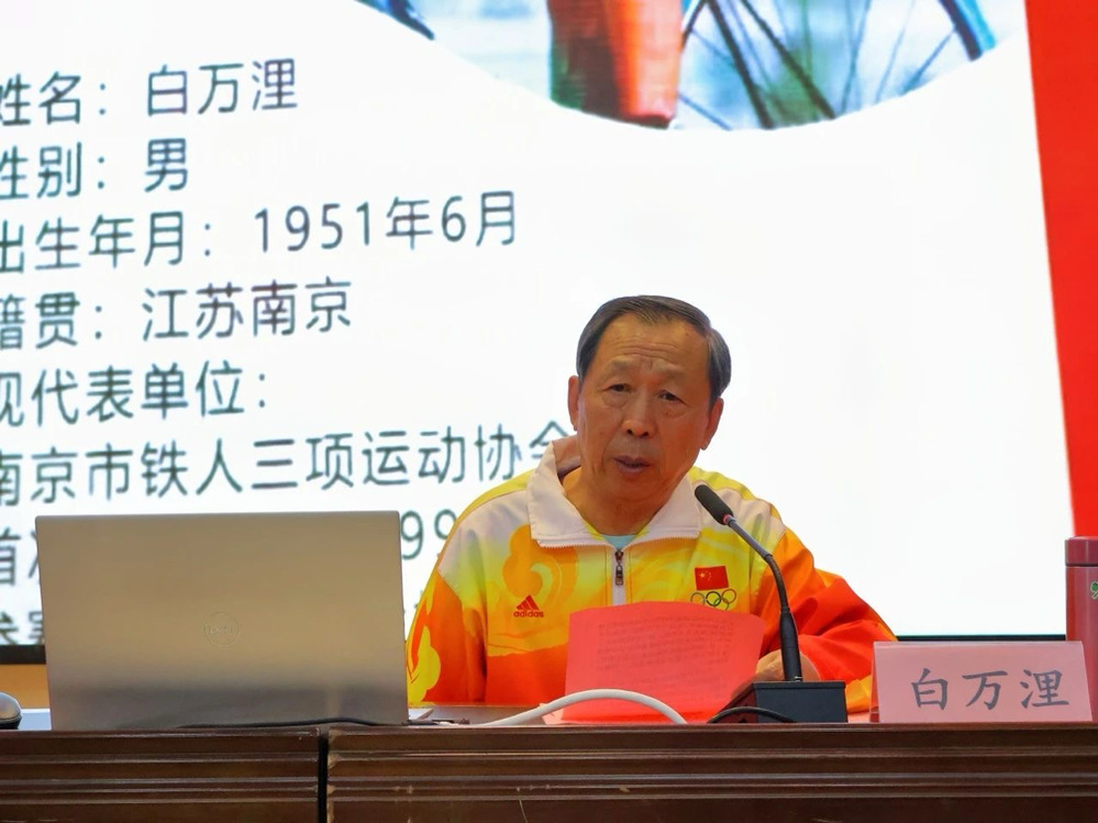 白万浬老师以《逆风飞翔,勇敢追梦——誓将奥运精神进行到底!》为主题,分享人生经历,诠释“奥运精神”、“铁人精神”。因公失去右臂,却不甘被命运左右。白万浬从小受父亲影响热爱游泳,受伤后将情感寄托于运动,进而接触铁人三项。尽管训练与参赛面临无数艰难,像资金短缺、身体伤痛等,他仍凭借钢铁般的意志坚持。他认为即便多次跌倒也要重新站起,这就是铁人精神。他用行动诠释奥运精神,斩获诸多荣誉,激励大家勇敢追梦、战胜困难。