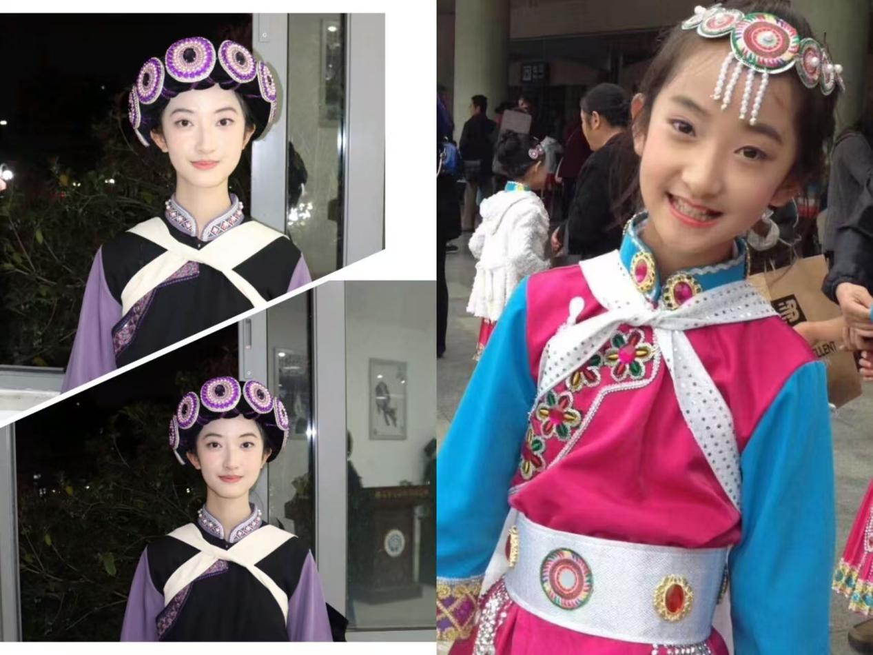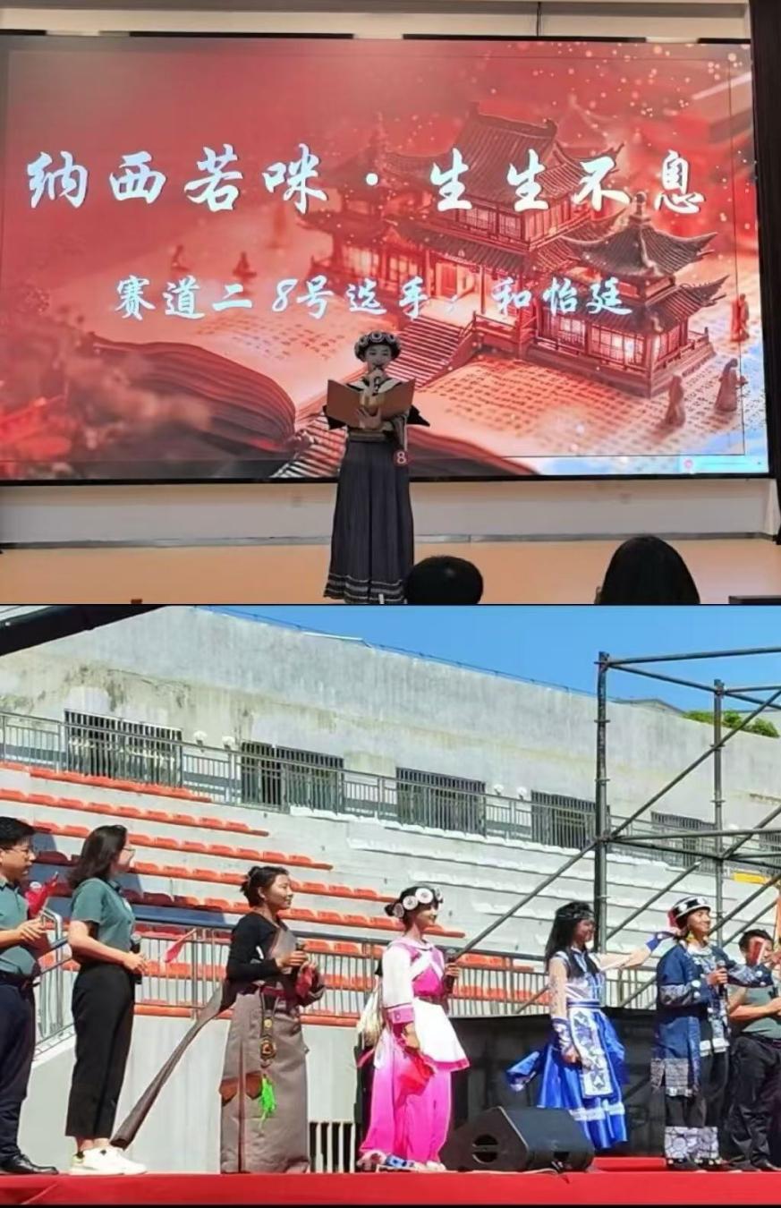 身为纳西族的一员,和怡廷同学自幼深受本民族文化的熏陶,传播纳西文化是她心中坚定的信念。儿时,她便登上中央电视台的舞台,与合唱团一同唱响纳西族传统歌谣;在六一联欢晚会的舞台上,她用纳西勒巴舞和摩梭舞蹈,向观众展示纳西族的独特魅力;进入大学后,她以少数民族代表的身份,多次参与学校组织的诵读家乡活动,让更多同学了解纳西文化。