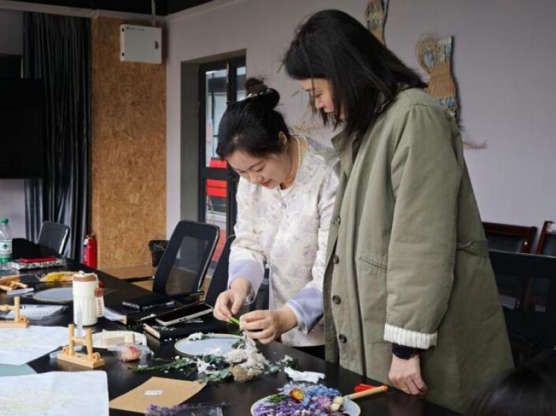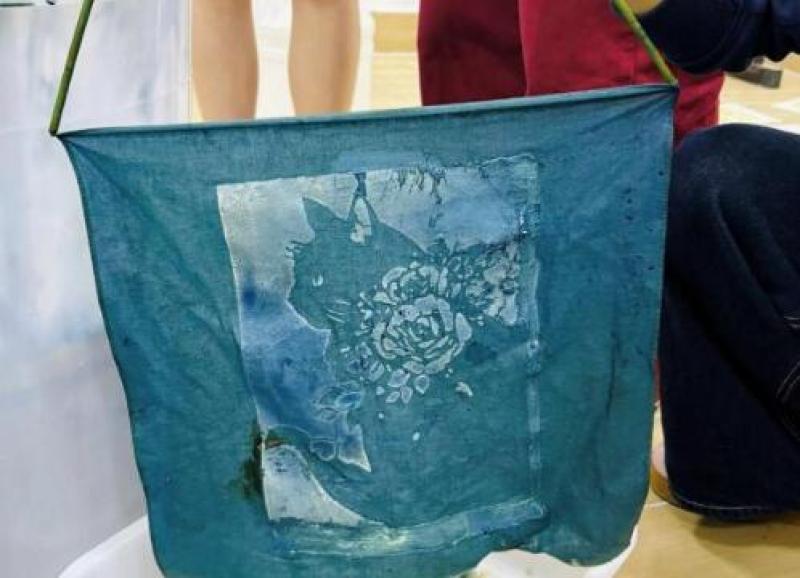 扎染体验区充满欢声笑语,党员们运用捆扎、夹板等传统工艺,让素白布料在靛蓝染料中完成华丽变身。蓝白相间的纹理,或如山川河流,或似云霞飞鸟,每一道痕迹都是传统染织技艺的精妙呈现。在合作过程中,党员们相互交流、互相帮助,党组织的凝聚力在这蓝白之间悄然增强,大家共同为这份古老技艺注入新的活力。