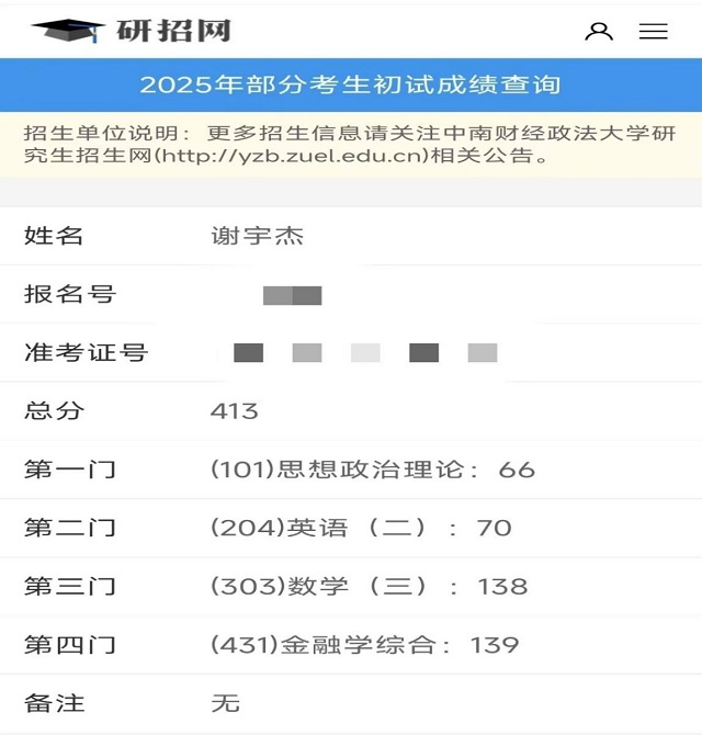 毕业方向:中南财经政法大学金融专业(全日制)