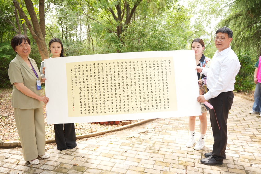 仪式上,教师教育学院向学校捐赠《鹤飞亭记》《重建鹤飞亭记》书法作品,校领导为教师教育学院师生校友代表颁发《捐赠赠书》,与师生校友共同为《鹤飞亭记》石刻揭幕。